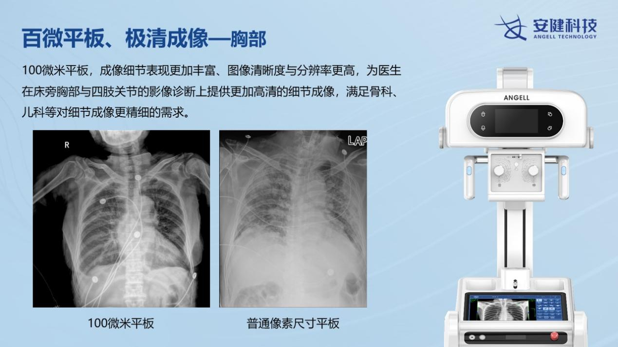 相较于普通DR的百万摄影像素,近2000万的高清像素,可以极大的提升床旁检查效率,包括骨科、新生儿科、心脏外科、重症监护科、急诊科等患者的快速检查。相较于目前市面上的低像素移动DR设备,100微米平板移动DR,在图像的分辨率、宽容度上都全面优于常规的130微米左右的移动DR设备。