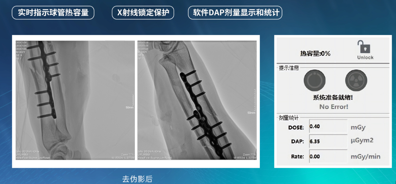 此外,骨科手术时间平均时长约为45分钟左右时间,长期的X线透视或摄影曝光剂量将对临床手术与操作医务工作者造成难以评估的健康风险,悦画通过支持摄影曝光参数的自主调节,可以保证在最低剂量水平下输出满足临床手术定位与引导所需要的影像质量,相较于市面上的固定曝光参数配置移动C臂,自主参数调节设计的曝光功能设计,可以大幅减少医务工作者的X线辐射剂量。