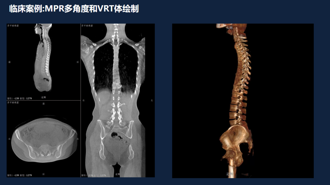 此项技术基于动态数字化X线技术平台打造,可实现立位三维成像,通过立位旋转站台带动病人缓慢转动,完成站立位下对检查部位的多角度扫描并且使用自动校正方式完成三维影像重建,剂量辐射水平远低于CT;同时也将原本DR的图像由二维扩展到三维,获得横断、矢状、冠状多方位图像。在精准呈现全身脊柱关节的立位三维摄影的同时更加真实地展示脊柱关节多种疾病的影像学信息,对脊柱关节疾病的相关手术方案规划、手术随访以及进展评估提供更加精准的影像学信息评估。