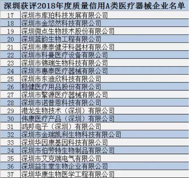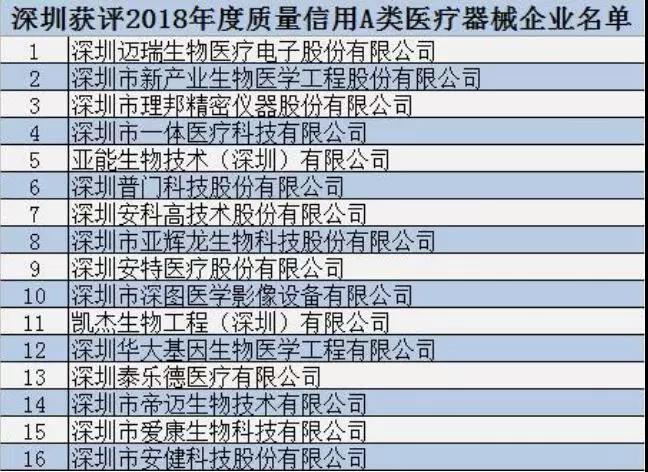附深圳获评2018年度质量信用A类医疗器械企业名单: